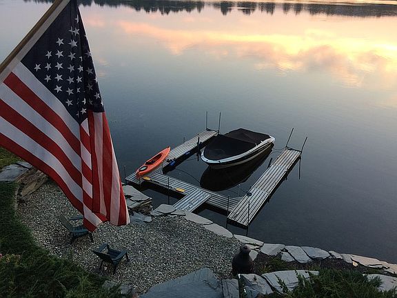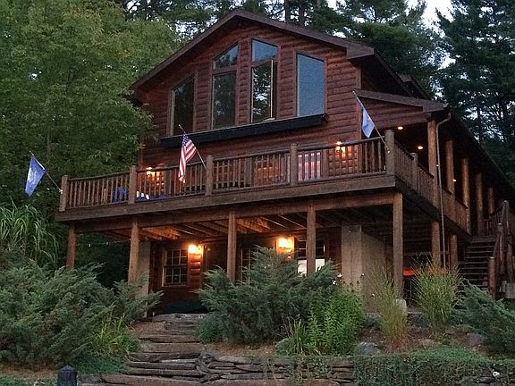 Enjoy incredible sunset views over Lake St. Catherine from this beautifully designed and crafted 2006 log home. The full length of entry porch opens to an expansive deck complete with awning taking in the views. A great entertaining house with an open kitchen, dining and living area with cathedral ceilings (magnificent chandelier), beautifully crafted wood floor and local slate inlayed floors, double French doors out to the deck and views. The custom kitchen is incredible with local slate counters and all stainless steel Fisher & Paykel appliances. Radiant heat keeps the house warm and toasty for winter months of ice fishing, sledding and skiing at nearby Stratton and Killington. One bedroom and a half bath with laundry finish off the first floor. Upstairs are three more bedrooms including the master suite with cathedral ceilings and a huge view over the lake. Completing the upstairs is a sitting area, a half bath and a full bath with local slate counters and a beautiful custom tile shower. Other amenities include a large walk-out ground floor with recreation room and French doors leading to massive slate stairs to the beach, All bathrooms have top of the line faucets/fixtures and lighting. The stunning property also has a two car detached garage with a large guest suite above with commanding lake views from the French doors and private deck. The guest suite has a custom bathroom with a wonderfully tiled shower in natural stone. Th lakefront has terraced stone walls with a large river rock patio and aluminum dock. Come make family memories in this very special year-round log lakefront home.