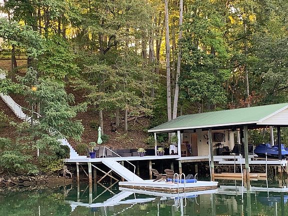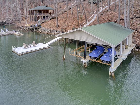 Furnished waterfront property in excellent condition! This single wide features a master suite, guest bedroom and bath, sunroom addition with walls of windows and gas fireplace, dining area, living room, spacious kitchen, office area, laundry room, and a single car garage. Designed for entertaining with a grand 2 slip dock, covered and uncovered areas, boat house, floater, 118 ft. of waterfront, deep water, covered front porch, back deck for entertaining friends and family, fire pit, fenced backyard, additional setting area for relaxing, beautifully landscaped, circle driveway, extra parking spaces, & mountain views. Jet Skis Negotiable.