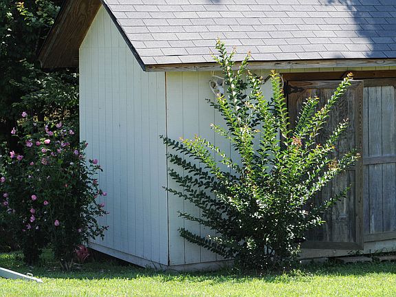 - EXTERIOR FEATURES: Wood Deck, Landscaped, Trees, Exterior Lights, Concrete Walks, Porch, Gravel Drive, Fenced Yard, Storage Shed, Garden Space