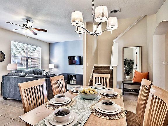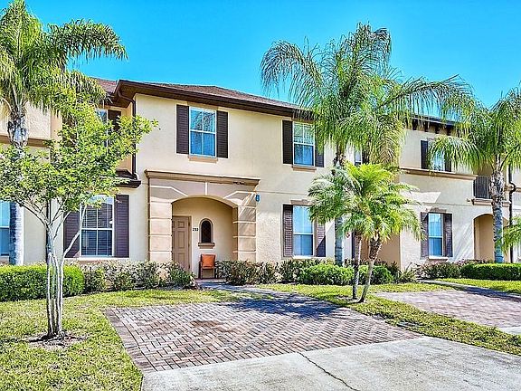 This spacious and bright family villa is located in the gated community of Regal Palms, within minutes from the gates of Disney and other parks, plus walking distance to grocery store, restaurants, pharmacy and more! This FULLY FURNISHED beautifully RENOVATED townhouse has 3 bedrooms, including two rooms with twin beds and a King bed in the master suite plus 2.5 baths. All beds have pillow-top mattresses with new pillows, flat screen TV's in the living room and every bedroom. It has a dining room, living room combo with two new couches, and kitchen boasts new stainless steel appliances and comes fully equipped with plenty of cabinet space and gorgeous granite countertops. There is also a back patio for you to enjoy an evening drink or morning coffee. The HOA fees include secured WI-Fi internet, unlimited Long Distance to both Canada and US, cable with hundreds of channels lawn maintenance, building insurance and maintenance of their two private pools, which is part of a 2-acre swimming pavilion, including a water slide, lazy river and beach-entry pool perfect for your little ones, outdoor Jacuzzi, playground and beach volleyball court. Inside is an exercise room with sauna and steam room, recently renovated brand new Spa, Restaurant/Bar and a mini store. The onsite restaurant and bar overlooks the pool, and you can enjoy a drink on the patio and pool area, including the poolside tiki bar. The restaurant also offers an arcade/playground area and resort has picnic/BBQ areas throughout. The Resort is perfectly situated adjacent from highly rated Highlands Reserve Golf Club and short drive from some of the most popular golf courses in central Florida including Southern Dunes, Ridgewood Lakes, Legends, Champions Gate Resort, Orange County National, Reunion and many more. This is a must see.