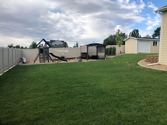 Beautiful move in ready home with an open floor plan, vaulted ceilings, large windows, can lighting, large closets, and large finished basement. In addition, to the 5 bedrooms and 3 bathrooms, it has custom cabinets, stainless steel appliances (double oven), hardwood floors, 2 water heaters, 3 toned paint, extra wide staircase, entertainment center, and a front room office. This home includes finished storage and cold storage rooms, built-in surround sound speaker system with projector hookup, and a large 2 car garage. The yard is fully landscaped with an automated sprinkler and drip system. It also includes a large sandbox, lifetime swing set, patio with attached pergola, RV parking, and a roll-up door 10 x 16 foot shed. The deck is newly built with trex decking and iron railing. This home is shaded in the summer afternoon/evenings and great for entertaining.