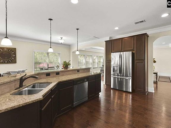 - RoomKitchenFeatures: Granite Counters, Recessed Lighting, Floors-Hardwood, Cabinets-Stained