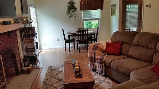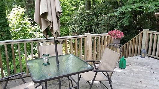 Two bedroom two bath with wooden deck, partially wooded lot, close to downtown on a very quiet road. Split bedroom plan for privacy. Living room fireplace with gas logs, custom cabinets, washer and dryer hookups, large wooden deck overlooking spacious yard and woods. First & security. No large dogs. Other pets considered on an individual basis. Available August 5.