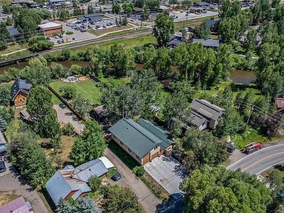 Magical! Unique! Wonderful property on a half acre on the Yampa River in downtown Steamboat Springs. The historic Brooklyn neighborhood is close to Howelsen for skiing and biking or to downtown for shopping and dining. The original main house has 3 bedrooms and 2 full bathrooms with a large slate entry / mudroom and laundry room. There is a private and shady fenced yard that is separate from the main backyard. This home has lots of recent upgrades including the primary bedroom suite, new metal roof, new windows, newer appliances, and new stucco siding. The detached garage / caretaker unit was built in 2022. It is a legal ADU and it features an upstairs apartment with a bedroom, bathroom, laundry, walk-in closet, full kitchen and living room. The living space has vaulted 10 foot ceilings with a gorgeous kitchen, an airy living room, and a second floor deck to enjoy the views. The garage space is tremendous; measuring 56 feet in length with 14 foot garage doors at both ends. Plenty of space to park a large RV, all of your toys and also 2 full size vehicles. A half bath downstairs and shop space complete the garage uses. The sidewalk between the 2 buildings is heated to melt away snow and ice. The hidden gem is the back yard with private access to the Yampa River! Incredible gardens, a green house, and a chicken coop flank the lush lawn and lead to the stone patio and steps for easy river access. You can wet a line, float a tube, or SUP from your backyard! A special property!