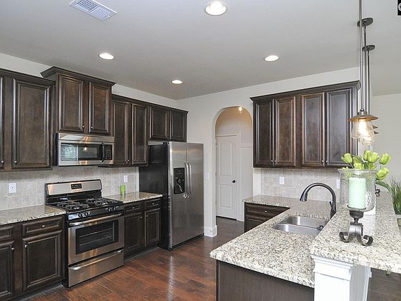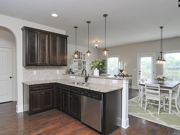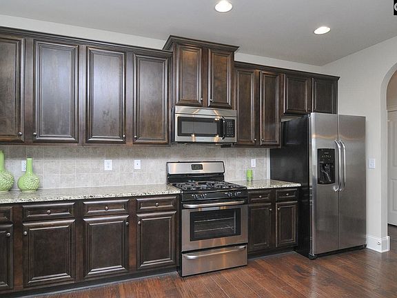 - Kitchen: Bar, Counter Tops-Granite, Eat In, Pantry, Floors-Hardwood, Cabinets-Stained, Backsplash-Tiled