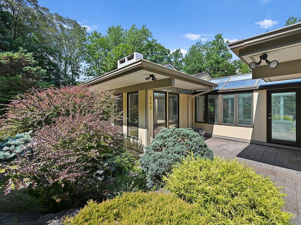 Nestled at the end of a peaceful cul-de-sac, this striking contemporary residence offers nearly 4,500sq ft of sun-drenched living space, thoughtfully designed for modern living. Set on two tranquil and private acres, the home is defined by dramatic walls of glass, soaring ceiling and a seamless connection between indoor and outdoor spaces. Key features include: 4 generously sized bedrooms and 4 full bathrooms. Vaulted living room with a fireplace, skylights and French doors that open to an expansive rear deck, perfect for entertaining or relaxing. First floor primary suite with a bright skylit bath. Eat-in kitchen that flows into to a beautiful glass-ceiling solarium. Walkout lower level featuring a cozy family room with fireplace, an oversized bedroom and two versatile bonus rooms - ideal as a playroom, home office or gym. Additional highlights include a whole-house generator and a flexible layout that offers space for everyone. Just minutes from town, this home delivers the perfect blend of privacy, comfort and convenience.