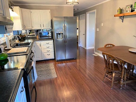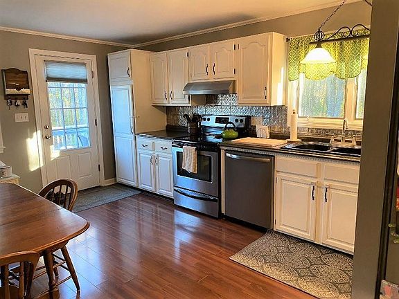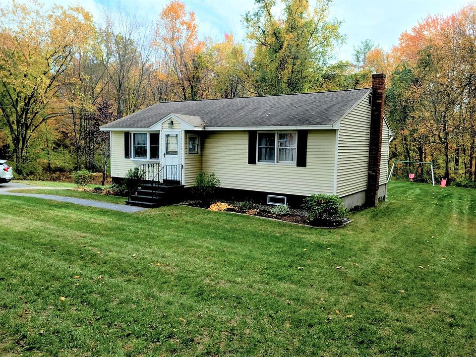 Nestled in on a beautiful scenic road is an adorable & well cared for ranch home. The main level features 2 bedrooms, full bath, a large eat in kitchen with stainless appliances, living room, primary bedroom with double closets & 2nd bedroom that looks out on the back yard. The finished basement is perfect for a family room or play room with 1/2 bath and an additional room for a possible 3rd bedroom or office area. Central air and beautiful laminate and vinyl flooring through out. Exterior features a large deck right off kitchen with plenty of space for full table and grill and underneath is fully covered storage perfect for holding all your yard tools, a detached metal carport that fits 2 cars plus a tractor or lawn mower with shelving unit within for additional storage All this on 1.98 private wooded/landscaped acres & in the SAU #16 school district. Showings begin at open house Saturday 10/29 from 11:00 - 1:00