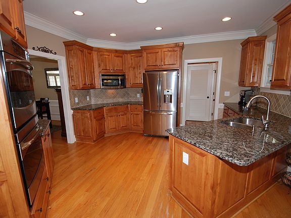 Reduced $25,600 from original price! Custom built, finished basement, minutes from White Oak Shopping, I-40, Hwy 70! Granite Counters, tile backsplash, stainless appliances, double oven, glass cook top, double stacked windows with 18ft ceilings, hardwoods on first floor, open wrought iron stair case, dual vanity sinks, office, exercise room, built in bar with pool table area, walk-in storage, additional storage in garage. 3 zone AC, fenced back yard, patio, cathedral ceilings, custom trim everywhere