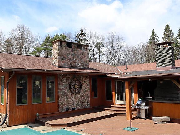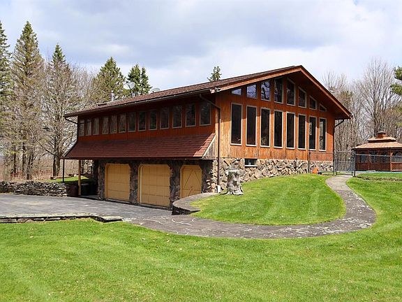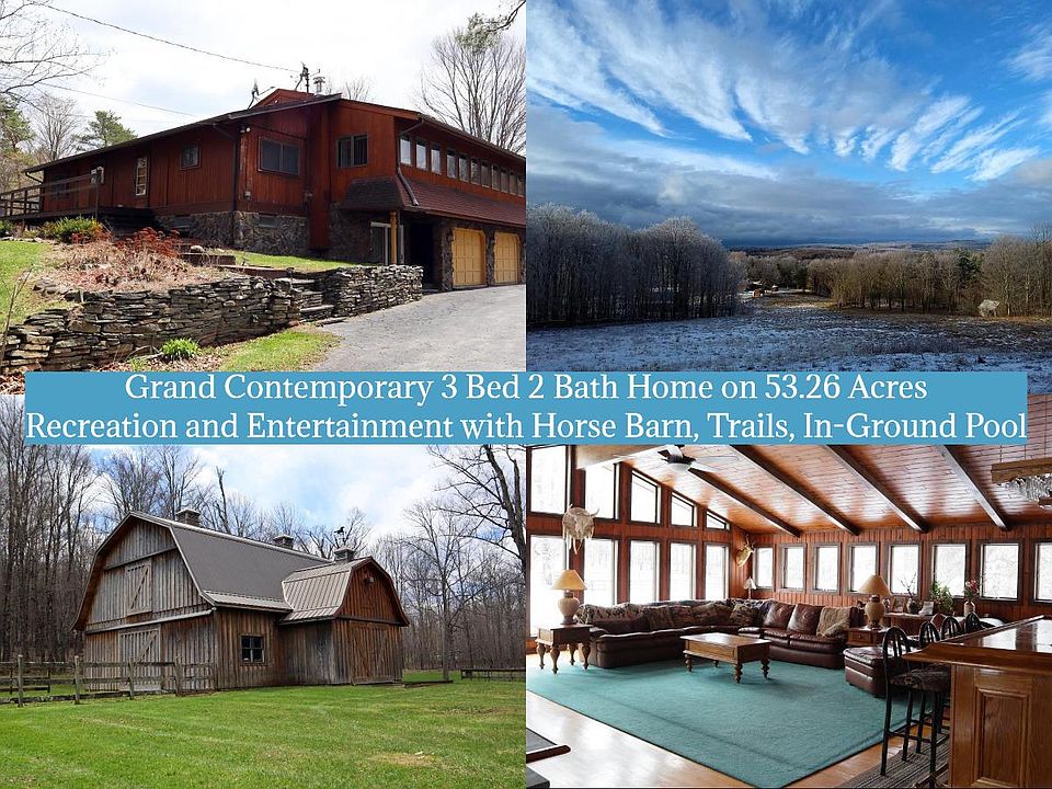 This grand contemporary lodge home, set serenely on over 53 acres, exudes class with features designed for relaxation, recreation and entertainment. The interior boasts an inviting, naturally lit 40x28 lodge room for entertaining in style, complete with built-in bar, a stunning granite fireplace with dumbwaiter for firewood transfer, and enormous windows showcasing views of the horse barn, in-ground pool, and meadows. Entering the open kitchen and dining area, gather around the stone fireplace, or around the chair-height central cooking/eating island. The dining area looks out over the front lawn and the ample wrap-around deck. The gleaming hardwood floors, pine walls and cathedral ceilings continue into two bedrooms, both with large closets. The master bedroom also has room for an office area or reading nook. The upper level is completed by a full bathroom. The lower level is easily entered from the heated 2+ car garage, or from the paved driveway, through glass doors, and into a flowing two room space which could be used for gaming, extra sleep areas, or a family room. This area is completed by charming rough-hewn barn beams which usher you upstairs or into the lower bathroom and, yes, the large sauna area. The exterior of the property features a 40x30, 6 stall horse barn complete with tack room and birthing room, leading out to the 80x50 wooden fenced turnout, and a partially fenced 3 acre meadow with water spigot. Exit the house from the breezeway between the kitchen and lodge room to the outdoor hangout space - replete with 36x16 foot in-ground heated pool (with slide and diving board), outside bar with stone countertops (including kegerator, sink, ceiling fan, lights), BBQ pit, and screened gazebo ideal for taking in all the action. In addition to the large lawn space, there is also a tennis court (will need re-surfacing). The remainder of the 53 acres has a network of quality multi-use trails through the mature woods perfect for quads/horses/x-c skiing/hiking/MTB . The land is mostly gently sloping, and has a pond in the main meadow, as well as a bonus tear-drop pond in the far corner of the parcel. Tucked whimsically in the middle of the lot is a rustic log cabin which could be used for camping nights, a writer's retreat, playhouse, or hunting camp.So many features, such a wonderful opportunity. Don't miss this chance for a real retreat to enjoy with family and friends. Adjacent property with 129 acres of private woods is also currently available, listing #124087, which could make this the perfect sprawling family compound.
