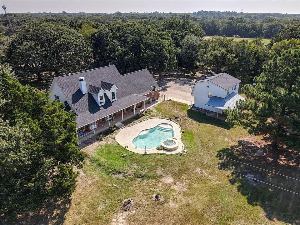 Sought after City of Combine TX with Crandall schools! Southern Living at its best, set on 3 acres with majestic Oaks, inground pool, detached second 2 car garage with apartment, water well, horse barn & pen for goats & chickens, Solar Panels, a detached shop, recent new roofs on home & buildings, expansive covered porches, vaulted ceiling in living room with stone fireplace, luxury vinyl plank flooring, crown molding, picture perfect kitchen with updated appliances, countertops & backsplash, stunning marble countertops in all baths & updated fixtures, frameless glass showers in both the master & 2nd downstairs bathroom, flex space over 2 car attached garage with second staircase could be a 5th bdrm! 2021-10-14