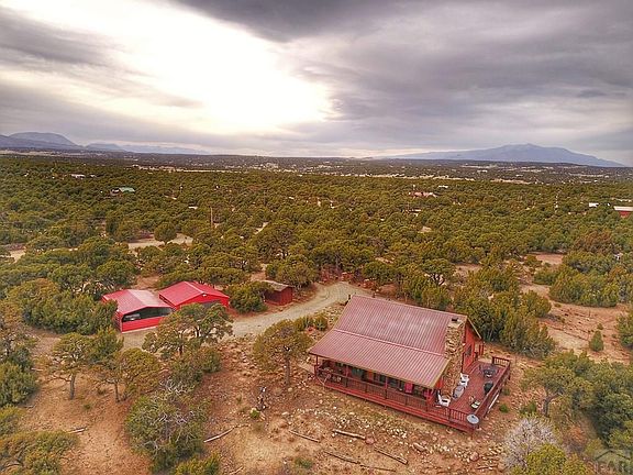 Beautiful - 3 Bedroom, 1 Bathroom Custom Home Sitting on 5 acres in Pinon Hills. Magnificent Spanish Peaks Views. Stone Fireplace with a Woodstove Insert, Beautiful wood floors in the majority of the main level and Custom Cabinetry in the Kitchen. Detached Oversized One Car Garage and a two car carport. Cedar Garden Shed and Decks on Two Sides of this Beautiful Home - Southern Deck is Covered.