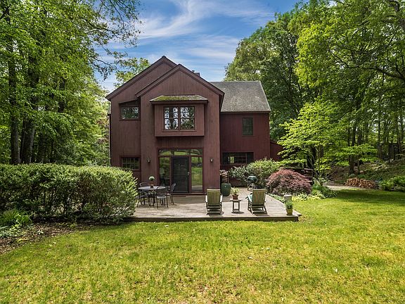 Tucked away on over three acres of professionally landscaped land, incorporating charming and functional outbuildings, gardens, stone walls and a bucolic spring-fed pond with dock, this beautifully designed post and beam barn reflects quiet and private country living in every way. An open floor plan includes a wonderful great room with French doors leading to a sunny deck, a thoughtfully remodeled kitchen with stainless appliances and island, and incorporating a large dining area, all warmed by a lovely fireplace. A separate laundry and mud room leads to another outside deck area. Also on this level a bedroom, currently utilized as an office, and a cozy den with an additional fireplace and custom built-ins offers the potential for one floor living. The upper level, with exposed loft, has three additional bedrooms, including a master suite with dressing room and full bath. The basement level is partially finished and functions as a playroom. This home is truly a private sanctuary for family and friends alike!