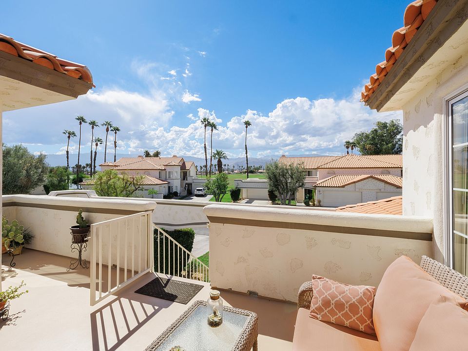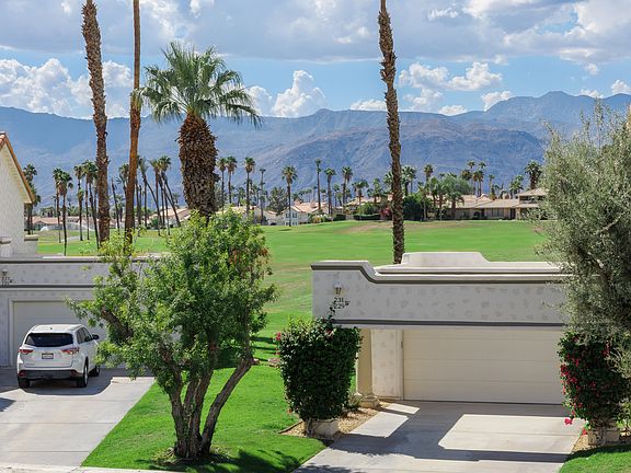Extremely desirable location, this updated 3 bedroom, 2-1/2 bath is situated on the Vista Royale loop - quiet with no through traffic and overlooking one of the largest pools and greenbelts in the community. The front deck boasts views of the western San Jacinto mountains and provides ample space for intimate entertaining. The kitchen has been remodeled with newer cabinetry, slab granite countertops, customized tile backsplash, stainless appliances, and updated LED lighting. Also featured is an eat-in, light and bright kitchen nook with mountain views. Tile flooring throughout kitchen, front bedroom, hallway, and baths. This condo offers a large, south facing window in the dining area. The back patio runs the length of the condo and can be accessed from sliding doors in both the living area and primary suite. The primary suite is expansive with a large, dual vanity bathroom. The junior suite features its own ensuite bath - ideal for your visitors' privacy. The back patio reveals the desert lifestyle with beautiful, relaxing views of the pool, palm trees, and green space. Ideal for watching the sunrise in the morning, during the day for sun bathing, or entertaining during the evening with the glow from the community pool and outdoor ambient lighting. Desert Falls allows short-term rentals and is ideally situated mid-valley with easy I-10 access, close to dining, retail, and groceries. Homeownership includes tennis, fitness, pickle ball, 24hr guard gate, and more.