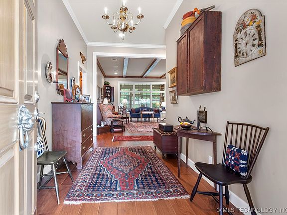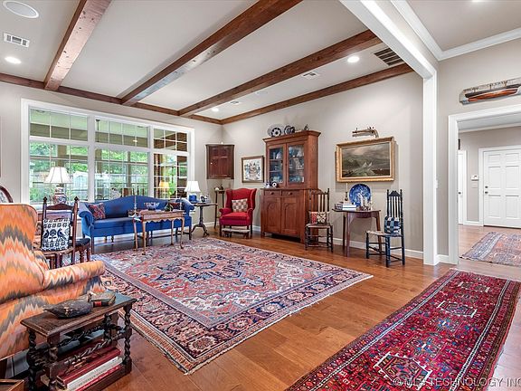 Beautiful custom built Colonial home by Roger Skelly that has been lovingly cared for and maintained. Full brick all one level in sought after gated community of Burlingame Ridge. Extensive design improvements over the last 5 years including a total renovation of kitchen by Sullivan's of Tulsa with new double GE Profile electric ovens, warming drawer, Bosch dishwasher, DCS gas 4 burner cook top and microwave in drawer. Custom cabinets throughout some with LED lighting for display and flush mount ceiling fans. Soapstone countertops and country sink with instant hot water. Formal living room with beams and heavy crown moldings throughout, separate family room with wet bar and fireplace with gas heater. Stereo speakers in ceiling of living room and one bedroom. Sunroom adjacent to kitchen and separate extra enclosed room with view of back yard. Utility room with storage cabinets and sink. Large master suite with two large walk-in closets and large private bath. Wood floors throughout living areas with tile in one bath and luxury vinyl tile in master bath. Anderson and Pella windows and doors throughout. Plantation shutters most windows. Electric shades in formal dining room and kitchen. Central vacuum with Hide-A-Hose. Additional attic insulation and floored storage above garage. Monitored security system, in ground sprinkler system. New roof January 2022. Oversized two car garage with many storage cabinets. Redwood privacy fence surrounding landscaped lawn with many crepe myrtles, shrubs, rose bushes and azaleas. Lush Tif-Green and Bermuda grass throughout front and rear lawns. A truly wonderful find in Burlingame Ridge!