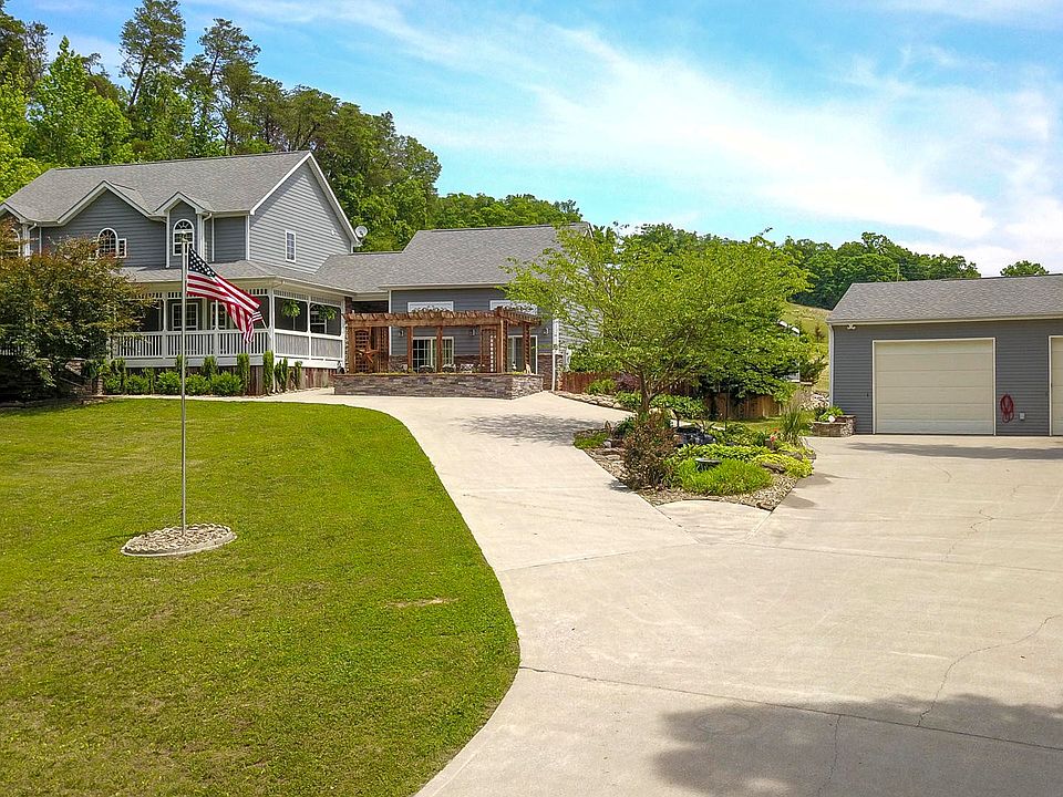 Beautiful Retreat on 5 Acres and seconds from the Lake! Boasting 4,467 Sq ft of living space, this property offers 5 Bedrooms, 3.5 Baths, Formal Dining Room, additional Rec room for pool table and additional seating off main living room and kitchen. An Entertainers DREAM! The possibilities are endless for this space. Large Theater Room with surround sound and soundproof insulation for those Movie Nights and Tennessee Football Game Days! This property also offers two large offices on the main level, one of which has a second Washer/Dryer Hook up. This could be the ultimate Laundry/Craft room. Outdoors you will find beautiful patios on the front and back both offering Pergolas for you to sit and enjoy the beautiful outdoors by the stone fireplace. A Large 2,450 sq ft Detached Garage/Workshop roughed in with Plumbing. CARS, BOATS, MOTORCYCLES and TOYS WELCOME HERE!! As well as an 8x10 Outbuilding, an Adorable 8x12 Gardening Shed for all your tools and a 13x15 Soild Concrete safe room. This property also has driveway access off HWY 72 for easy access with those Boats,Trailers and Equipment. Minutes from the world famous US 129 Dragon! 3 of the 5 acres are fenced and ready for your fur animals- This could be your mini farm you've been dreaming of.