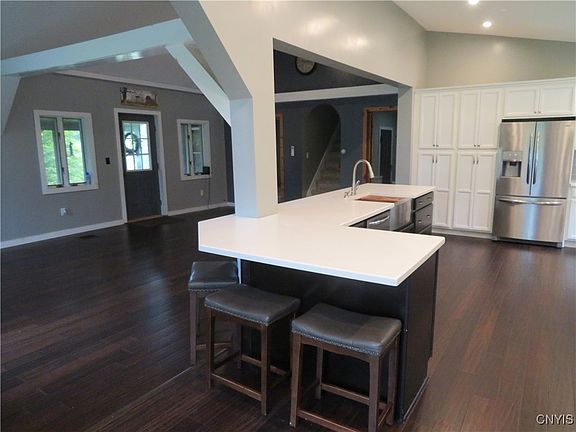 Experience the charm of country living with a modern twist in this beautifully renovated home. This old-style country house has been expertly updated to blend classic appeal with contemporary convenience. The first floor enjoy an open layout with a stunning kitchen at its heart, featuring solid surface countertops, custom self closing cabinets, and an inviting island. Enjoy easy living and entertaining with an open floor plan. Other features include heat pump for year-round comfort, and a wood-burning furnace for alternative heat source, open front porch, detached garage/barn, private setting, swing set and more. This is country living at its ultimate best!
