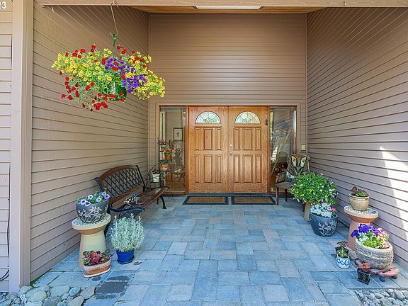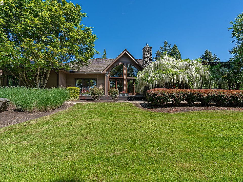 Beautiful and rare small acreage (dividable--buyer to perform due diligence on regulations) in town with drop-dead gorgeous A-frame executive home. All one-level living with broad hallways and wide doorways, vaulted ceilings and skylights. 3-car garage + spacious workshop -- 1280 combined square feet of garage space! Inside: Greatroom design with wood-burning rock fireplace, granite countertops, cook's island with top-flight induction cooktop, french door convection oven, Bosch dishwasher and Subzero refrigerator/freezer. Prepper's dream pantry. Massive primary suite with jet tub and walk/roll-in oversized shower, dual vanities and a cedar-lined wardrobe/dressing room. Vaulted bonus/formal dining room with wall of windows, french doors to wrap-around deck. Extensive grounds with paver pathways meandering throughout, well landscaped with flowering perennials and trees and raised garden beds. City water and sewer! Circular drive, solar-powered security gates.
