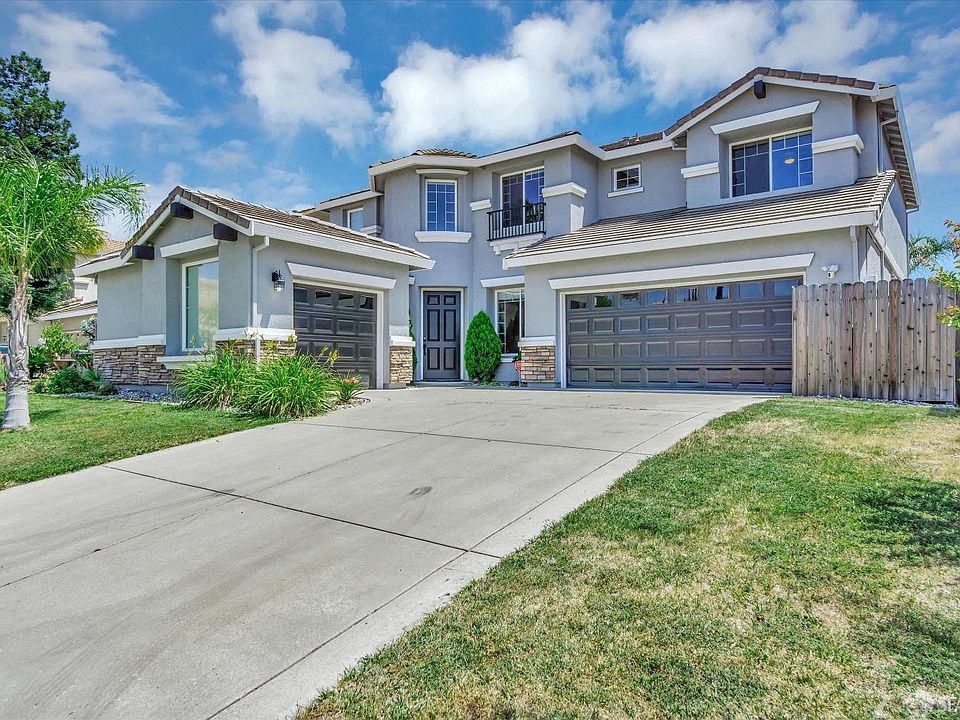 Nestled in a quiet and private block, this North-facing home offers a serene escape from the bustling outside world while being conveniently close to Lone Tree Mall and major freeways. The distinctive turret entry sets the tone for the sophistication within. Step inside to discover a spacious and light-filled interior boasting high ceilings and newer flooring throughout. The freshly painted kitchen cabinets adorned with a sophisticated color palette add a touch of timeless charm to the heart of the home. Versatility abounds with an office featuring French doors, easily convertible into a 5th bedroom to suit your needs. The open floor plan seamlessly connects the formal dining area, ideal for hosting memorable gatherings, to the cozy family room equipped with a ceiling fan and fireplace, offering warmth and ambiance during cooler evenings. Outside, the low maintenance and wide-open backyard provide a serene retreat for outdoor enjoyment and relaxation. Additionally, a third separated garage offers ample space for your toy storage or workshop needs, catering to the lifestyle of the modern homeowner. Experience the perfect balance of tranquility and convenience at 2320 Quartz Way, where every detail has been thoughtfully curated to elevate your living experience.
