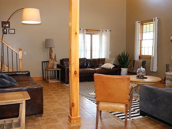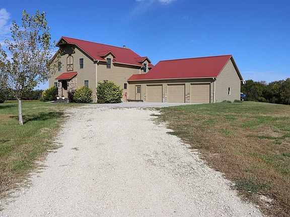This is the DREAM country home you have been waiting for! A beautiful setting of 14 acres with water views backing up to woods and creek 5 minutes from town. FANTASTIC floor plan with loft master suite and office overlooking the living and kitchen areas. Master bath includes jacuzzi tub and huge 2 person shower with double heads. Walk in closet. Windows everywhere to take advantage of the sweeping country views from all sides! Rural water, lagoon and propane. Huge vaulted beamed ceilings, wood floors, open staircase, wood burning fireplace, formal dining, open kitchen with eating bar, appliances include 6 burner gas stove, concrete counter tops, 2 main floor bedrooms each with their own full bath, along with a half bath for guests! Basement is plumbed for a bath and ready to finish if you desire. Wonderful outdoor entertaining space with wrap around deck. Views of sunsets and water cant be beat! Irrigation well on the property along with large shed. Over sized 3 car garage attached with breezeway.