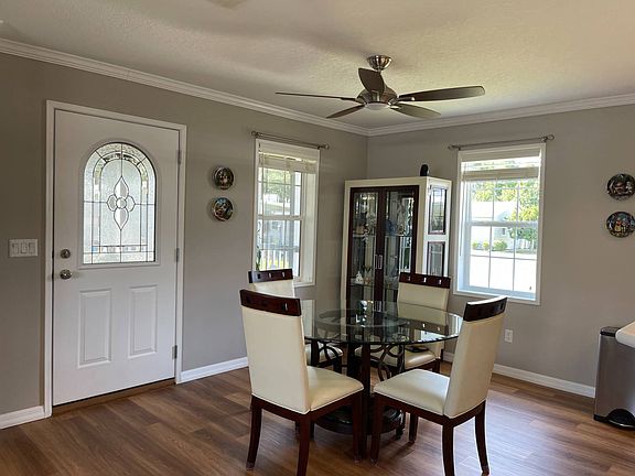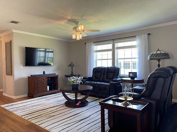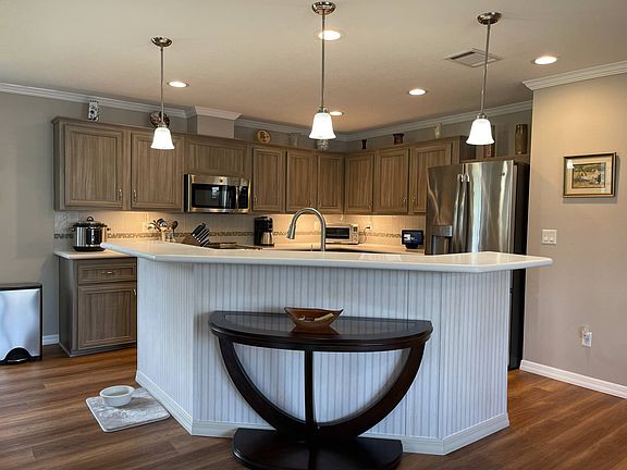 This home is a 2018 Jacobsen Homes with 1456 Sq. Ft. of living space. It has Thermopane windows and Vinyl Plank flooring throughout. You're going to enjoy living in the open concept split floorplan for years to come. The gourmet kitchen has under cabinet lighting, full backsplash, dishwasher, upgraded 3/4 horsepower garbage disposal, convection oven with glass top range, Corian counters with undermount sink, all of which is just a year and a half old, plus a French door refrigerator with ice and water door dispenser and mic. Both bathrooms also have Corian countertops with undermount sinks and waterfall faucets. The oversized master bathroom features a luxury, tiled walk-in shower with a glass enclosure. The guest bath has fiberglass tub/shower combo. The screened-in lanai offers views of the morning sunrises while enjoying your cup of joe, and many relaxing evenings. There is also a quaint outdoor area for your "fur-ever" friend. The Cart Shed is oversized with plenty of room for storage. This home is being offered partially furnished with the golf cart seen in the virtual tour. Don't forget to subscribe to our YouTube channel while viewing that. If you fell in love with this home, give us a call to make it yours!