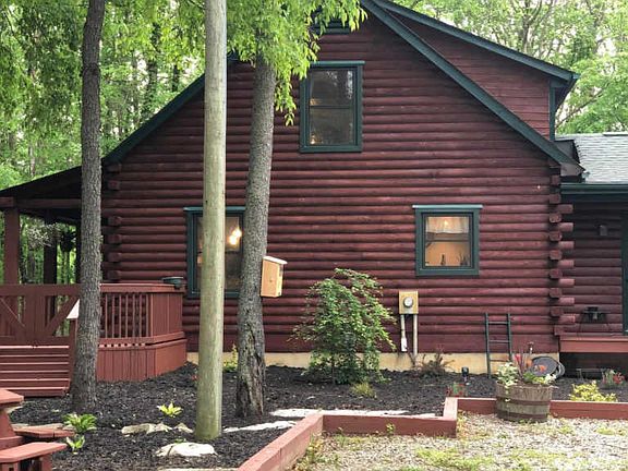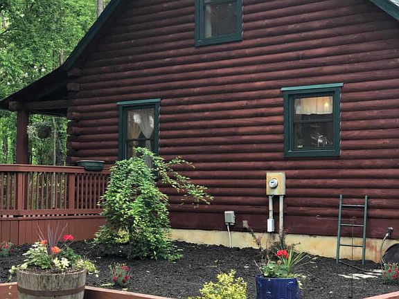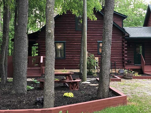 This impressive log cabin tucked into a secluded 5 acre wooded lot is serene, quiet and stays cool. Covered front porch & two-tiered back deck & hottub, great for entertaining. Fenced in front yard. Three car attached garage, third bay perfect for workshop or additional storage. Recently updated Bath & Kitchen with quartz waterfall breakfast bar, New windows, Newly stained exterior. Vaulted Family room with exposed beams, stone wood burning fireplace. Second level has the Master Bed/Bath, skylights & cozy loft office area. Basement, if finished, could add livable space & includes a Kinetico system. In-law suite with entrance through the garage, adds more sq. footage with separate furnace, full bath, washer/dryer hookup. Located just outside of Raymond & minutes to Honda & St. Rte 33.