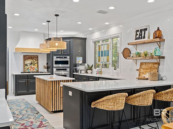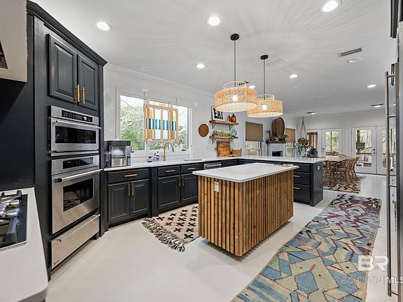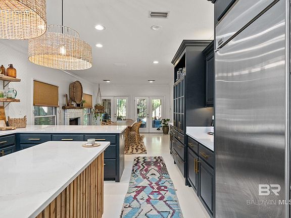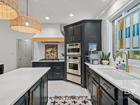 SOUTHERN CHARM & ELEGANCE meets sophistication and superior remodeling in this Montrose masterpiece! Functional floor plan offers an ease of flow from the dining room with fireplace to open study, through the scullery area, into the chef’s kitchen with under mount single bowl sink, sub zero fridge, independent ice maker, kitchen aid dishwasher, thermador oven, cafe gas cooktop, & monogram advantium microwave oven. Food prep & entertaining is emphasized with quartz counters with ample bar space, herringbone tile backsplash that continues along the accent wall, under & over cabinet lighting & surround sound system. Large breakfast nook with fireplace can seat many & leads into the great room featuring double sided fireplace with built in cabinetry, shelving & custom wood accent wall. Durable yet aesthetic painted wood flooring is found in living areas, kitchen & primary bedroom on main level. Primary bedroom boasts tray ceiling & fireplace with access to patio. Spa like primary bathroom with double vanities, separate water closet, & Aqua jetted tub is recessed for ease of entry. Upper level holds 3 large bedrooms each with their own full baths & oversized closets as well as vaulted bonus room with ample storage space. Bottom level includes full en-suite with living area, kitchenette, access to utility garage, full bath with steamer shower and 2 bedrooms. Relax in very private serenity on large deck with screened in enclosure. Live oaks abound in and around the enormous back yard backs up to dense wooded area. So many amazing features make up this incredible home such as plantation shutters, plumbing for food prep sink in kitchen island, 3 car garage AND utility/golf cart garage to name a few! Call today for a personal tour of this incredible home located just minutes from downtown Fairhope, Daphne and the bay!