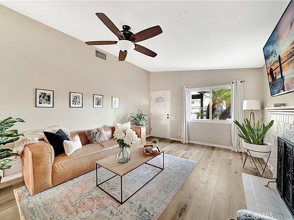 SINGLE LEVEL VIEW Home on quaint and Friendly CUL-DE-SAC. This home has so much to offer. Enjoy the Firework Displays Disneyland has to offer as well as the community fire works each Fourth of July from your private yard/patio. This fully landscaped back yard has a putting green, stand alone jacuzzi, and Alumawood patio with ceiling fan, and roll up screens for added shade and comfort. Relax and enjoy the view sitting around your built in Gas Fire Pit and indulge in a home cooked meal using the outdoor cooking station with BUILT IN BBQ and hot and cold sink. You can also enjoy seasonal fresh peaches from your tree. There's nothing like enjoying the sunset views from your own back yard with family and friends. This home is move in ready and includes, updated; dual pane windows, sliders, kitchen, large dining room or use space as additional family room. All baths have also been updated as well as the roof and rain gutters. Kitchen has stainless steel dish washer and double oven, recessed lighting, bar seating, and opens to the large dining room with new sliders and chandelier. Dinning room slider leads you out to the covered patio. The family room has a cozy and updated fireplace, mantel, high ceilings and ceiling fan. New bedroom carpeting installed in 2019. New Luxury Vinyl Plank flooring throughout the rest of the home installed in 2019. New Water Heater in 2021. New backyard fence and both side gates installed in 2022. All new can lighting has been purchased and will be left for buyer to install if they choose. Main bedroom has ceiling fan, walk in closet & bath offering an oversized walk in shower with dual shower heads, Italian Marble counter top, newer cabinet, sink and floors. Second bathroom has relaxing jetted tub, updated floors, vanity & sink. Your 2nd and 3rd bedrooms are spacious with closet organizers, crown molding, one w/chair rails & one w/Wainscoting. The attached 2 car garage has 220 volts, new epoxy floors in 2022, custom Built-in cabinets, overhead storage, and gas laundry hook ups. Composition Roof installed around 2013 and warrantied by McCormack Roofing with a life expectancy of up to 50 years. GREAT HOME with membership to the Mission Viejo Lake with an annual fee under $275.00 per year. This HOA fee does not enforce rules on your home and neighborhood it is only for the lake use.