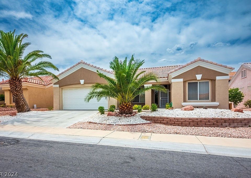 Nestled on one of Sun City Summerlin's finest streets, this rare 1,346 square foot Monarch model offers a coveted layout with bedrooms situated on opposite ends for optimal privacy. The exterior boasts meticulous upkeep, adorned with lush palms and attractive hardscape. Step inside to discover a freshly painted interior complemented by laminate flooring except in the tiled baths and kitchen. The spacious kitchen has SS appliances. Relocated laundry area to the garage creates additional interior space for a versatile den/office/craft room. Natural light fills the home thanks to strategically placed windows.Backyard beckons with a large extended patio cover and fruit trees Oversized 2-car garage with room for a golf cart. Sun City Summerlin offers 3 golf courses, 4 pools,gyms, social and sports clubs and activities galore! And, Downtown Summerlin is nearby with dining, entertainment & the practice arena of the Golden Knights, and the Las Vegas Ballpark where triple A baseball is played.