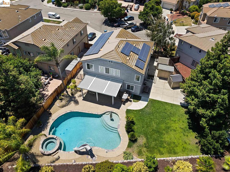 Welcome to your new home! This spacious and bright home boasts a modern floor plan with accentuated high ceilings and ample natural light. With a total of 5 bedrooms, 2.5 baths. On the first level, you’ll find 1 bedroom, this bedroom was fully permitted approx. in 2010 the extended garage portion was converted into your 5th bedroom, a versatile bonus room near entry that can be utilized as an additional bedroom, a playroom or home office, catering to your specific needs. A spacious formal dining room! Remodeled kitchen in 2021, with a island, newer gas stove, perfect for culinary adventures! Spacious upper level with 4 bedrooms, 2 bathrooms, and office nook. The primary bedroom suite has a walk-in closet, newly remodeled in 2023 primary bathroom with dual vanity, a soaking tub & stall shower. Home has abundant storage, a designated laundry room & dual zone heat/AC. Large premium lot 11,030 sq ft, with park-like backyard, covered patio newly installed 2021 with ceiling fans a beautiful 40x20 pebble tech bottom pool with slide and built in hot tub. Perfect for entertaining! Centrally located with easy access to Hwy-4, Shopping Center and less than 2 miles to Antioch BART. Fridge, washer, dryer, garage fridge, all backyard sheds, BBQ, Patio Table and Chairs convey with property.
