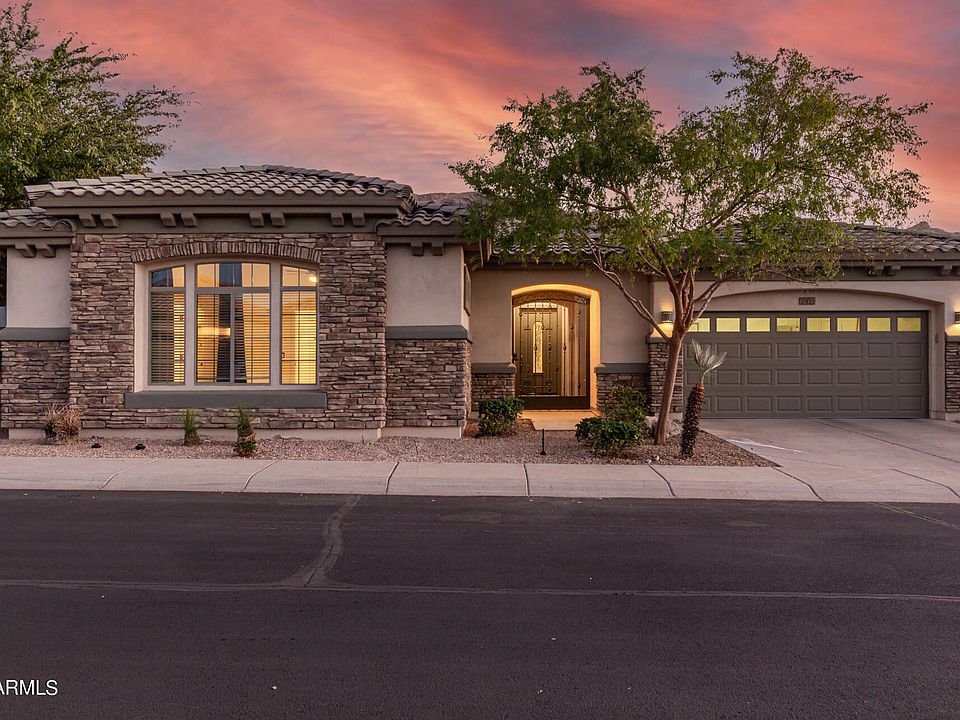 Embrace sustainable luxury in this 4-bed, 3.5-bath energy-efficient residence adorned with solar panels, a charming stone facade, and a welcoming courtyard! The living/dining room is perfect for receiving guests. The family room with a cozy fireplace offers an excellent spot for intimate moments. The kitchen features granite counters, cabinets with crown moulding, recessed lighting, SS appliances, a chic tile backsplash, and an island with a breakfast bar. A versatile den is ideal for an office. The main bedroom showcases natural light, a fireplace, an ensuite with dual sinks, and a walk-in closet. The backyard boasts a covered patio, gazebo, and a sparkling pool, all set against mountain views - perfect for enjoying stunning sunsets