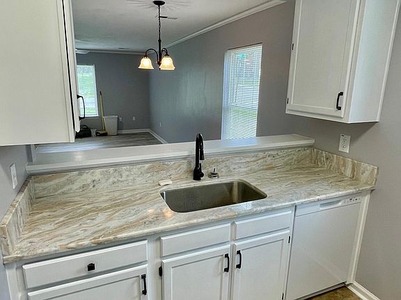 Beautifully remodeled home in a super convenient location featuring an updated kitchen with new solid surface counter tops,painted cabinets, a new oven/range and dishwasher, a modern back-splash, & a new kitchen sink and faucet. Other updates include new vinyl plank flooring and carpet, fresh paint and stylish new ceiling fans, a remodeled bathroom w/new vanity top, mirror, sink, faucet & storage cabinet, all new interior doors along with door knobs and hinges, a new front door, fresh paint on the exterior front porch, foundation and shutters along w/a large flat backyard. This home has lots of storage for its size & a large primary bedroom w/walk-in closet & chair rail molding and a covered front porch. The roof is older but doesn't leak. Sellers will replace roof w/a full price offer.