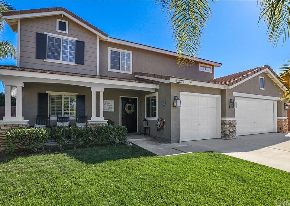 Beautifully upgraded home in the charming community of Wildomar.This very well maintained spacious 4 Bedroom, Bonus room and 3 Bathroom home boast 2,467 sq ft of generous space for living.Living/formal dining room features beautiful wood flooring. As you continue to the great room, you see a kitchen that opens to the family room which features, custom window shutters, custom built-ins (Mantel, TV Cabinet) and fireplace. Kitchen is open with granite countertops, stainless steel appliances, French doors that open to the back yard, tile flooring and an abundance of cabinets & counter space! Upstairs is the Primary Bedroom with French doors opening to a large deck patio, primary bathroom with dual sinks and a spacious upgraded closet! A bonus room sits off the master bedroom that can be used as a sitting room or workout room. Fully carpeted, the upstairs also includes three additional bedrooms and one full bathroom. Indoor laundry room with plenty of cabinet space and attached two car garage. Originally a 3-car garage, sellers converted to an additional room downstairs, perfect for guests, in-laws, mancave, or home schooling! The driveway has plenty of room for RV parking, and the side yard also has room for extra toys/storage. The Backyard is private and spacious, play area for the kids and plenty of room to entertain or add a pool. Recent upgrades include: new patio cover and Deck, new exterior paint.