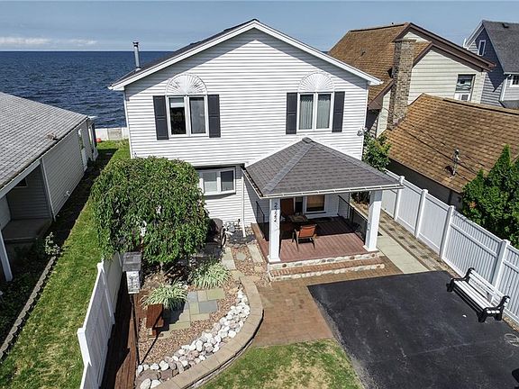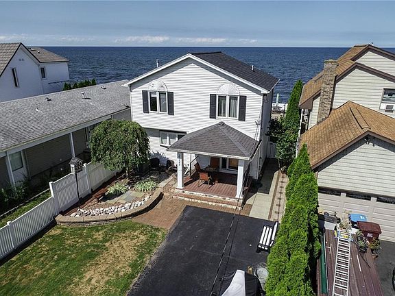 Attention Lake Lovers! Live right on Lake Ontario, and it's a vacation every single day with stunning lake views, sunsets and lake breezes while relaxing or entertaining on your lakeside patio or front porch. Boaters, put a hoist in! This home is on a double lot with access to Long Pond as well where you can go boating, jet skiing and fishing. Enjoy the beautiful lake views from every room on the first level with easy flowing and open floor plan. No flood insurance required, and a steel break wall backed by concrete will give you added peace of mind. Cathedral ceiling in front living room and in Master Bedroom. Vaulted ceilings in other 2 bedrooms, full baths and upper hallway. Home reconstructed in 1991 from foundation up. One full bath has a jacuzzi tub to soothe those muscles after a long day. Tear off roof 2017 with architectural shingles * Central A/C 2013, Furnace 2009 * Water Heater 2017 * Driveway garage side 2016 * 2nd floor laundry. Appliances are included. This home is move in ready. 3rd BR not photographed as used for storage; dimensions are 12 X 11.5. Check out the virtual tour!
