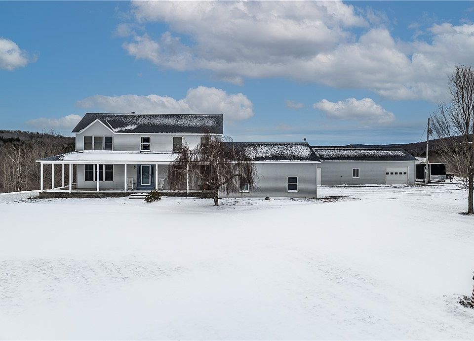 Custom built one owner retreat on close to 8ac w/360° views over the rolling hills of Madison County. Int. feat. h/w throughout 1st floor w/grand foyer, expansive Kraftmaid kitchen w/huge breakfast bar open to d/r area. Enormous front to back family room w/sliders to full wrap around porch overlooking front/side yard. 2nd floor: large primary b/r en suite (w/laundry) & custom w/in closet + balcony office. Two add'l b/r w/double custom closets + full hall ba.. Bsmt has add'l 1,200+ sqft space w/custom bar area + bonus rm(exercise or playroom). Att. 3car garage w/mudroom pantry storage leads to add'l insulated (heated w/coal stove) enteretainment/workshop space. This space features a hot tub area w/sliders to beautiful pool(w/Tiki bar) stove & kitchen cabinet area with full custom bar/gameroom space! 4th garage w/tall o/h door is perfect for boat, RV storage. Add'l att. storage area w/o/h door + shelving for yard equip.. Well insulated & econ. heating options w/2 coal pellet stoves & Oneida Mad. Elec. Co-op. Wired for backup generator. True serenety abounds w/deep setback from main road - 5 min to Erieville Res., 15 min to Caz Lake, 20 min. to Hamilton and 40 min. to Syracuse.