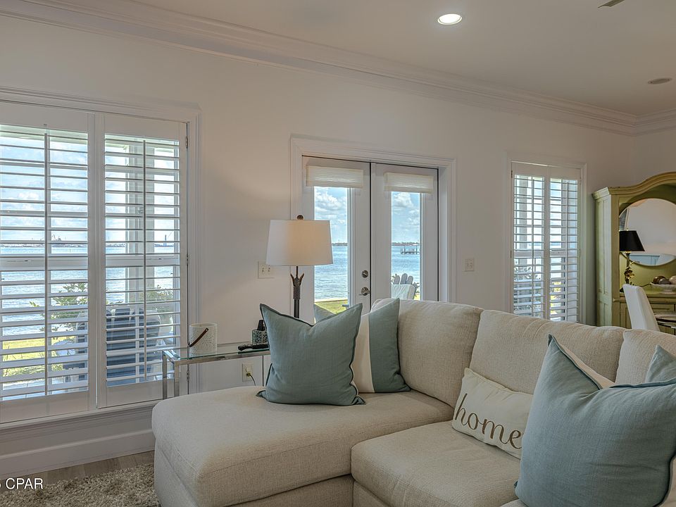 Highly Desirable Rare Opportunity to own this Stunning Waterfront End Unit. 46 Feet on St. Andrews Bay! This home is the Second largest property in the community. The modern kitchen has all upgraded stainless steel appliances well designed soft close cabinets and 2 pantry cabinets which allow for plenty of storage. The Living area includes a wall mounted electric fireplace for Warmth and Beauty. Newly installed 72'' modern ceiling fan. Modern light fixtures. Sprayed insulation in roof provides lower power cost. Gorgeous views of the Bay from the living area and kitchen. Crown molding and plantation shutters add character and charm. This spacious home includes 3 Ensuites. The Master bedroom includes a large walk in closet, Master Bath with Soaking Tub, private tiled shower and separate Toilet Room. Double vanity. Private Balcony showcasing gorgeous views of St. Andrews Bay. Second bedroom is spacious and cozy with an attached bath. Jacuzzi tub with double vanity and shower. Private Balcony. Third bedroom has a spacious cozy room with double closet, private bath with tub and shower. Private balcony. The spacious 2 car garage can be conveniently accessed from the 1st floor Foyer. New Sod has been planted along with new pavers for the walkway, steps and drive. This Prestigious Community includes a Beautiful pool, Hot tub and clubhouse overlooking the bay. The Nature Walk is located on a 7 acre preserve. There are also several docks in the community for boating, fishing and kayaking right from your backyard. Don't miss this opportunity to see this beautiful piece of paradise...~MOTIVATED SELLER!