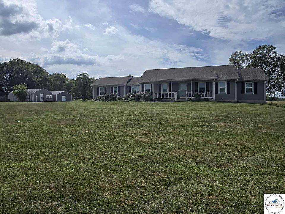 What a fabulous ranch home on 5 acres just outside of Harrisonville. Country living at its finest. This spacious home has the ability to house two families if desired or needed. The main level has an open floor concept with 3 bedrooms, 2 bathrooms, a spacious recreational area which could double as a man cave or work room as well as a play room with french doors. The lower level is like a separate living area which has an additional kitchen, laundry, bedroom, 2 bathrooms, family room and media room. Very tastefully done. The home sits on a treed lot with a pretty lane leading to the house. Outside you will find a storage building as well as a Quonset building turned into an adorable living quarters. This is a rare opportunity!