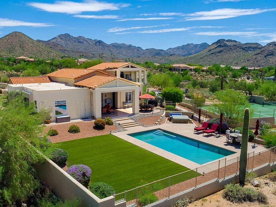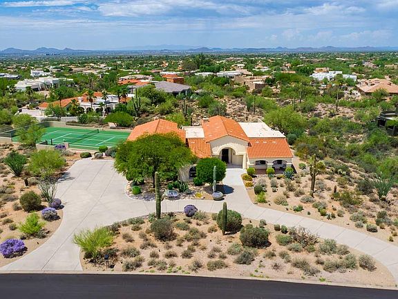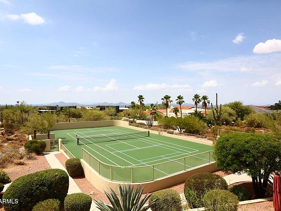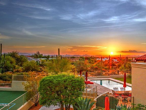 Welcome home to your private resort oasis on 1.5 acres with tennis/pickleball court, pool, hot tub, putting green and incredible Sunset and Mountain Views! This special home offers, 3 bedrooms, 3 baths, 2 half baths, living room, den/office and 3 car garage. Both ensuite guest bedrooms and the primary suite with a private sitting room and luxurious spa like bathroom with steam shower and large walk-in closet are all downstairs on the main level. The totally remodeled eat-in kitchen has an island, granite counter tops and views of Pinnacle Peak. The fabulous backyard with tennis/pickleball court, pool, hot tub and putting green has a large covered patio with automatic screens and misting system perfect for year round outdoor living. In addition, all of this is conveniently located close to shopping, dining, hiking, golf and the loop 101.