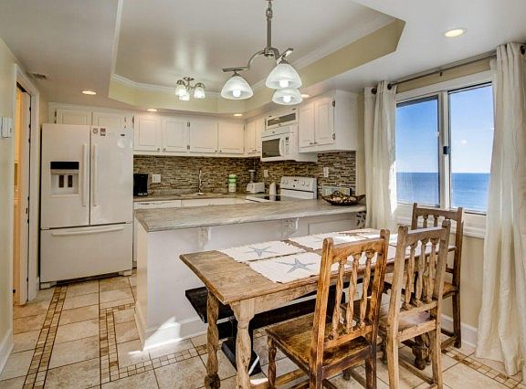 Completely updated immaculate penthouse unit at Pinnacle Port! Beautiful custom tile floors throughout the first floor, plus the upstairs baths. The full kitchen features ocean views, new countertops, a glass tile backsplash, and a breakfast bar. A rustic farm table in the dining area creates a feeling of home. The living area is equipped with a complete furniture set with sleeper sofa, a wall mounted flat screen TV, and access to the private Gulf front balcony. Upstairs, the master bedroom boasts its own private balcony and an en suite bath with new tub. The expanded second bedroom has two bunk beds and stunning ocean views, with a full bath down the hall. Pinnacle Port is ideally located at the west end of Panama City Beach.
