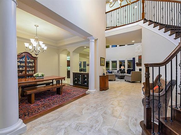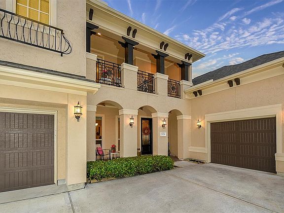 From the moment you enter, you know you are truly home! This is a lifestyle, not just a place to live. Soaring ceilings, a dramatic entry w/spiral iron staircase & arched doorways invite you. The open concept is great for entertaining or just relaxing w/family. Tile floors throughout most of main living area. Wood floors in Formal Dining, Study, Media & Master Bedroom. Kitchen is a cook's dream w/stainless appl. incl. 6-burner gas cook-top; dble ovens (both convection), & stacked stone back-splash w/large center island & beautiful wood cabinetry. Multi-story stone gas fireplace in Family Room. Soaring wall of windows provide great views of the wooded Greenbelt in back. Work from home or just stay organized in the spacious Study, 3 covered patios. Master suite is gorgeous w/wood floors, a curved bay-window sitting area, & trayed ceilings. Master bath has spa-like feel w/jetted tub; sep, shower, dble sinks & arch framing tub. Lake/Walking Trails, Adjacent to Exxon Campus. NO FLOODING!
