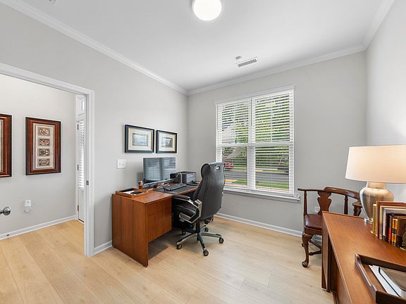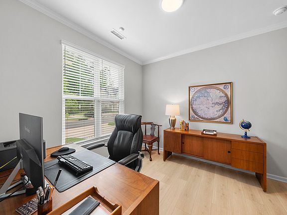 Phenomenal North Raleigh location, this beautiful home offers the best of modern living with a spacious layout that feels brand new. Boasting 5 bedrooms and 4 full bathrooms, this meticulously maintained residence is perfect for families seeking comfort and style. The first floor features exquisite crown molding, premium LVP flooring throughout, complemented by a versatile bedroom ideal for use as an office, alongside a convenient full bath. The heart of the home is a chef's dream kitchen, complete with an oversized island, elegant quartz countertops, stainless steel undermount sink and appliances, and gas cooktop with vented hood. Adjacent, a welcoming family room and dining area bask in abundant natural light, creating a warm and inviting atmosphere. Upstairs, the second floor hosts 9 foot ceilings, a luxurious primary bedroom retreat with an expansive ensuite bathroom featuring dual vanities and a stunning glass walk-in shower. Two additional generously sized bedrooms, another full bath, a versatile bonus room, and a dedicated laundry room with a utility sink and walk in storage closet complete this level. The finished third floor offers flexible living options with a spacious bedroom featuring double closets, a full bathroom, and a versatile flex space perfect for a hobby room or study. Ample unfinished walk-in storage ensures plenty of space for seasonal items and more. Outside, unwind on the relaxing screened porch overlooking protected natural land, while a fenced backyard provides privacy and security. This home seamlessly blends comfort, style, and functionality in a highly desirable location!