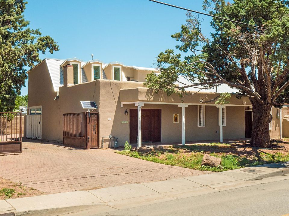 Text Stefanie for more information to rent this property as a furnished rental for short or long term @ 505-550-8487 or to schedule a showing. This house is often rented as a month to month rental. Ask for the Air Bnb listing link for additional photos and details. A unique property with a unique situation! This home is located in a cute little compound minutes walking distance from Old Town. Feel secure with this gated community. Featuring an expansive downstairs with an open floor plan that is ideal for entertaining and enjoying this great New Mexico unique architecture. Upstairs, you'll find a large bedroom with an en-suite bath, and loft. The house also features a pool that is available for the summer months only. Presently the home has been completely renovated and is fully furnished. Both downstairs bedrooms have en-suite bathrooms as well with the master bedroom having an attached sauna.