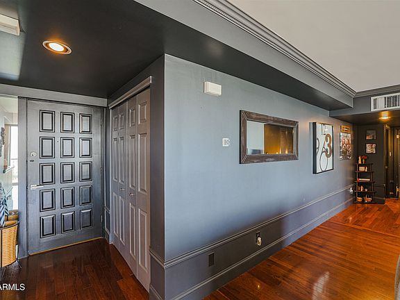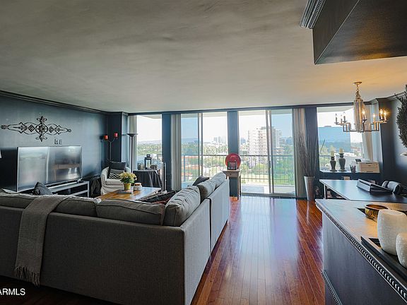 This condo is in EXCELLENT condition with many upgrades and has been VERY WELL loved and gently lived in. Walk in the front door to a wide open floorplan with ceiling-to-floor windows gazing at your face with stunning southern views of city lights, sprawling mountains, the iconic Heard Museum & breathtaking sunsets you can view right off the great room, kitchen, or, the huge balcony! Cherry wood floors dominate this unit along with Travertine in the bathrooms. Canned lighting and custom lighting fixtures throughout allow for a serene ambiance. Large crown molding & baseboards add flare & pizazz. The master bathroom and walk-in closest are HUGE. The bathroom includes a large separate area that can be used for a vast array of likings. Let's talk location & HOA: