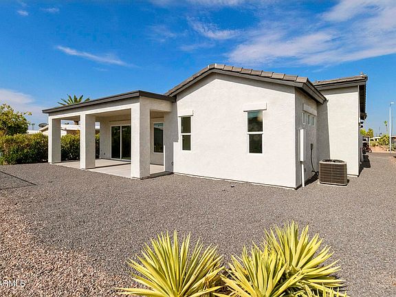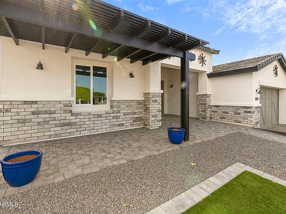 This spec home is now READY for it's very first homeowner, and this could be YOU. As you enter this open concept home you will see shiplap in the entry and crown molding through out the living room. Now this is your first sign of the quality of this home. The kitchen is a dream kitchen that features creamy colored cabinets and a black island that holds your dishwasher, double pull out trash drawer and a stainless steel farm sink. Stylish granite that pulls these two colors together and it runs up the wall behind the 5 burner gas stove. Your oven is a double oven with in itself, check it out with a microwave above it. The fridge is an eye catcher, the left top door opens twice to expose the water and ice feature plus an area that holds a pitcher of water. The living room is a great size and features a sliding glass door that takes you out to the covered patio that features gas stub outs for a BBQ or gas heater. There are 2 bedrooms and a den/office, the office has a walk-in closet the 2nd bedroom has two closets, one for short items and one for long items. The primary bedroom will hold a king size bed nicely and has a switch on either side of the bed to turn on the bathroom light during the night, nice feature. Very nice bathroom with a walk-in shower, 2 vanities, a linen closet and a walk-in closet. Laundry room has a folding countertop and gas for the dryer. The garage is 20x25 with an insulated garage door, tankless water heater, epoxy flooring that runs partially up the wall, room for storage, plus the outlet for an electric vehicle. Pavers complete the landscaping, very tastefully done, zero work to be on this yard, just sit back, relax and enjoy your front patio under a metal trellis and wave at your neighbors.