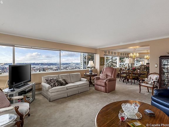 Great chance to live in a premiere location. This is a wonderful 7th floor unit with views of the mountain, city and hills. The surrounding area offers restaurants, shopping and one of Portland's most beautiful parks. Private garage parking and a large secured personal storage roomHOA dues include Taxes, 7 Days a week Concierge Services and many utilities.