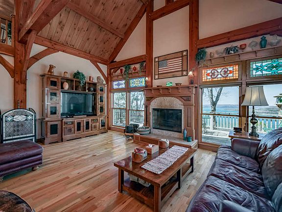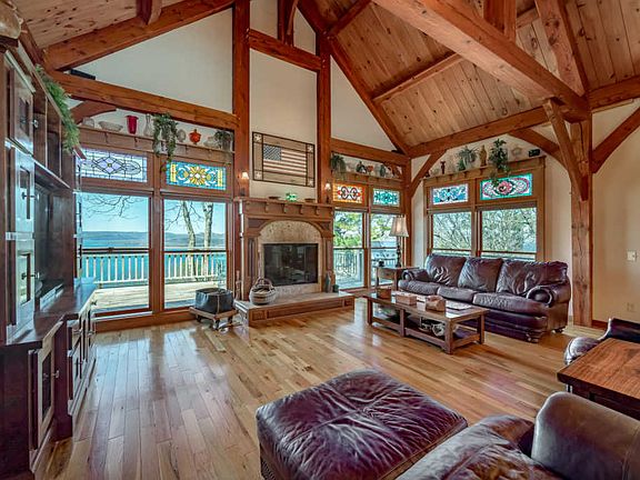 Impressive craftsmanship throughout and so much attention to detail. A stunning view of Table Rock Lake from nearly every window. This 3 bedroom / 3 bathroom sits on a little over an acre and is surrounded by a quaint lake community. Multiple bonus rooms could be converted to bedrooms if needed. The perfect lake retreat with plenty of room for the toys and an RV hook-up with dump station. Boat slip available for purchase as well 12' x 30'). Below are some of the unique features of this beauty:The great room (and porch) is ''timber frame'' using Douglas fir lumber. Only oak pegs hold these precisely cut mortise and tenoned joints together. All the doors on the main level are custom hand crafted white oak, as are all the cabinets throughout. All cabinetry and trim is either walnut (island) or white oak with walnut trim. A combination of craftsman, Quaker and early American styles are employed. The kitchen corner cabinet includes a salvaged 100 plus year old beveled glass door from a farmhouse in Ohio. All drawers in the kitchen employ 100# rated drawer slides.The fire place is unique, built of white oak with walnut accents. A concealed compartment on the side stores fireplace tools out of sight. A set of custom glass doors can be closed to improve energy efficiency. Stair treads to the loft suite are made from an American walnut tree cut down in Tulsa.The beautiful ten stain glass transoms, the beautiful light fixtures, medicine cabinet door, window accents, and the ''sunrise'' window in the great room, and doors are true leaded panes, not foil that is so common. The back wall at the stove is a tiled ''warm glass'' floral. Tiles are multi leveled stain glass pieces fused together under extreme heat to create the colors and pattern. The same technique was used to create the front porch fixture. Lower level bathroom is quite unique. The fixtures were salvaged from the Thomas Gilcrease mansion in Tulsa. The Gilcrease mansion was built in 1922 almost 100 years old!