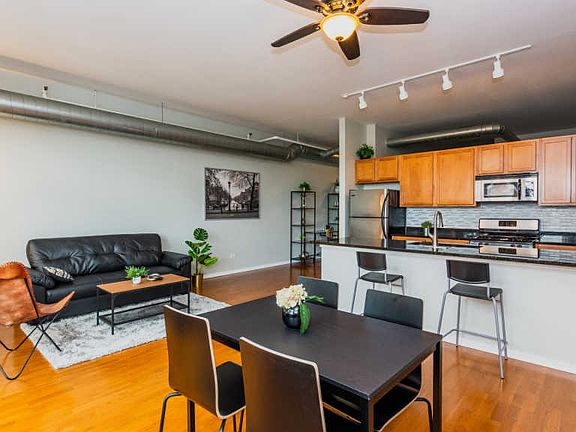 Top floor fully move-in ready updated loft w city & tree top views in full amenity highly rated McKinley Park Lofts*Foyer opens to wide hall w closets & bonus office nook*10 ft high ceiling open-floor plan allows entertaining w ease from modern granite eat-in kitchen feat. stainless steel appl, double sink & ample cabinets*Spacious light-filled living area provides space for proper dining & private balcony access overlooking well-groomed courtyard, the park & incredible sunset views*Retire to roomy master w sizeable walk-in & private access to crisp dual entrance bathroom for convenience & privacy*Great closet space*Building feat. gated access, elevator, gym, party room, bike room & onsite manager*Parking space & storage cage included*Great access to dining on Archer, accessibility with Western ave*Imagine living across the street from an incredible park like having a huge backyard & nature retreat with pool, tennis, basketball, baseball diamonds & lagoon*Come see your new home today!