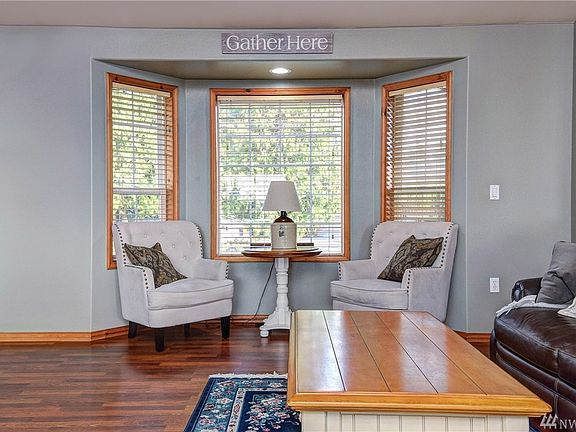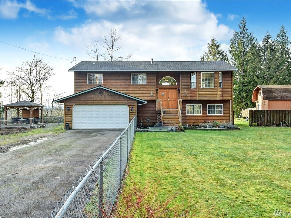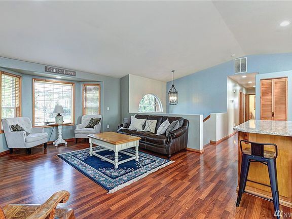 Beautifully Updated 2,444 home with river & mountains views! RV Parking! No HOA! 4 Large bedrooms, (3 bedroom septic). Open kitchen, breakfast bar, quartz counter tops, double oven, vaulted ceilings, a great space to entertain. Large living room, propane fireplace with river rock surround, bay window & laminate flooring. Master Suite with full bath walks out to your large deck to enjoy your view. Beautiful, bright lower level family room with wet bar & propane fireplace. Over an acre lot! Oversized garage with shop area. Heat Pump/ AC, New roof, new gutters, new water heater, new washer & dryer, new cooktop & both fireplace replaced! Fully fenced front yard & a long driveway. Property runs down to the creek. Minutes to downtown Arlington!