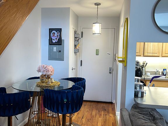 the duplex also features a cozy living room and a dining area with kitchen. The apartment have hardwood floors throughout.