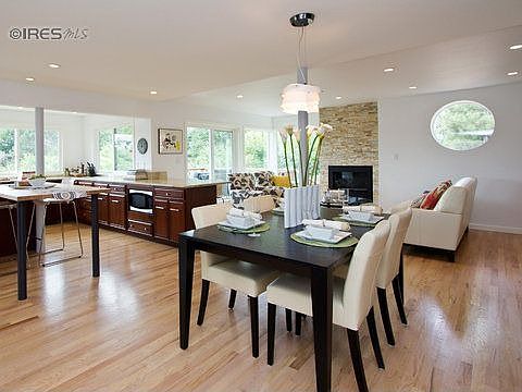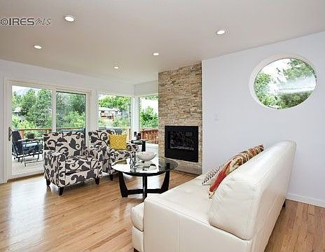 Location, location, location and unobstructed mountain views from every room, looking directly southwest out at Bear Peak from huge new back deck! Total remodel completed in 2013. Open floor plan in this 5 bed/3.5 bath modern contemporary style tri-level home on almost a half-acre. Tons of light with 3 beds and 2 full baths upstairs, 2 beds and 1 full bath downstairs, and a half bath powder room on the main level. Four (4) sets of large new sliding glass doors and 3 contemporary gas fireplaces, new dining room, and 2 family/living rooms on main floor (both with fireplaces) and 55"+ flat screen TV wall mount in family room on main level. Finished walk-out basement with 2nd full kitchen and rec room (with 3rd gas fireplace), another 55"+ flat screen TV wall mount, and another set of built-in speakers; on fenced half-acre lot with seasonal stream, lots of mule deer, hawks, owls and other wildlife; amazing quiet, privacy. Secret cul-de-sac of 13 homes, rare opportunity! Total remodel, including new roof, cement roof tiles, new full yard fence with 3 gates, updated commercial-quality sprinkler system and new landscaping, finished in 2013. Grass backyard overlooks a peaceful meadow and ravine with seasonal stream, the famous Devil's Thumb rock formation and all the Flatirons. Easy walk to many trail heads for hiking and close to base of NCAR road. Scope of remodel also included new plumbing, electrical and nearly all windows are new and upgraded, including 3 new sets of large sliding glass doors. New 600 sf composite deck (EverGrain) runs the entire length of the back of the house with 200 degree views of mountains and city lights. New modern metal & frosted glass 2-car garage door, new Dark Sky-certified exterior lights and all new front door and natural stone entryway with engraved glass inserts in front door; Colorado flagstone used in new patio on front and all the way around the side of house and in new front steps; low-voltage lighting built-in along front and side walkways and around front patio. Brand-new chef's kitchen with spacious built-in banquette and solid marble table that can seat 8+ for family dinners, all granite counters, rich solid cherry cabinets, all new stainless appliances, including double GE Profile electric ovens (2) and GE Profile microwave, Viking gas cooktop with Italian-made Futura range hood, Bosch dishwasher, LG French-door refrigerator (22 cf), new walk-in pantry, new granite wet bar with solid cherry cabinets and 24-bottle wine refrigerator. Three (3) gas fireplaces with natural stone and tile surrounds, including one in the cozy library/family room. All new light hardwood floors on main level and new carpeting in top floor bedrooms, large new double and triple-pane windows throughout and 4 sets of sliding glass doors (3 are new). New full guest bath, new master suite and master bath, including new 15' master bedroom balcony (EverGrain also) with stunning views of the city lights, Flatirons, and millions of bright stars in this Dark-Sky Zone neighborhood. New double sinks and vanities in master bath, huge mirror, new soaking tub, separate toilet room, and enormous new custom-tiled, glass shower. New washer and dryer in laundry room. Built-in speakers for music on both main floor and lower level. Rock gardens, stone paths, commercial-quality sprinkler system (5 zones), large backyard patio accessed by lower-level glass sliding doors, lots of wildlife, and two large new decks. Walk-out basement with rec room and 2nd kitchen-(great in-law/nanny area) with 18 cf Samsung French-door refrigerator and stove. New int/ext paint, int/ext lighting and natural gas line extended out to main deck to almost new Weber Genesis gas grill (no need for propane tank). 5 bedroom house (1 makes a great study!), 3 full, and 1 half baths. Walk to trails, bus, NCAR, Bear Creek Elementary School, super S Boulder schools!