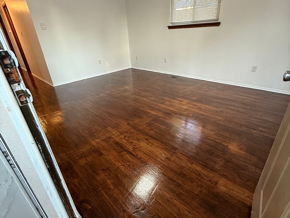 Large living room with recently stained hardwood floors, & a wall cut out to the kitchen